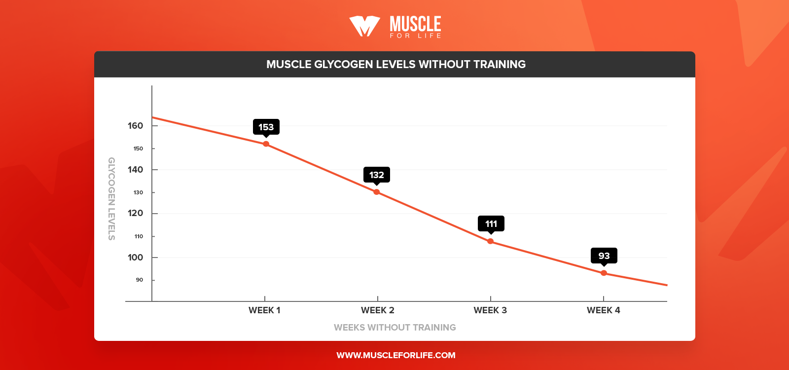 After only one week of detraining, your muscle glycogen levels can drop by 20%, and after four weeks your glycogen levels are close to half of what they normally are.